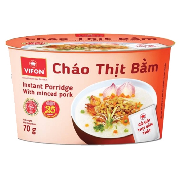Sản phẩm cháo ăn liền tiện lợi từ thương hiệu cháo Vifon. Cháo thịt bằm Vifon gói 70g được làm từ các nguyên liệu tươi an toàn cho sức khỏe, đặc biệt có gói thịt bằm thật chất lượng, thơm ngon, đủ dinh dưỡng cho một bữa ăn mà lại cực nhanh và đơn giản.