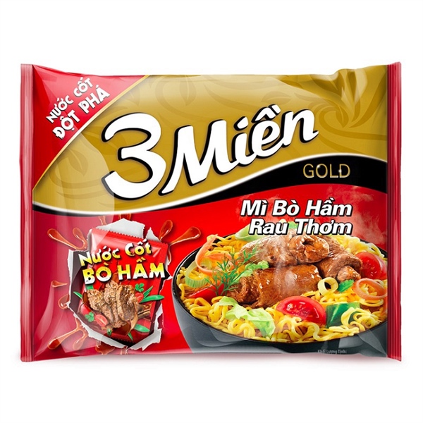 Với sợi mì dai ngon hòa quyện cùng nước súp đậm đà, hương vị thanh đạm mang lại những trải nghiệm thú vị. Gói gia vị 3 Miền đậm đà có dầu thực vật, muối, đường, bột thịt heo, bột hành, bột ớt, hành lá sấy, cà rốt sấy, bắp sấy. Mì 3 Miền Gold bò hầm rau thơm 75g là lựa chọn tuyệt vời không thể bỏ qua
